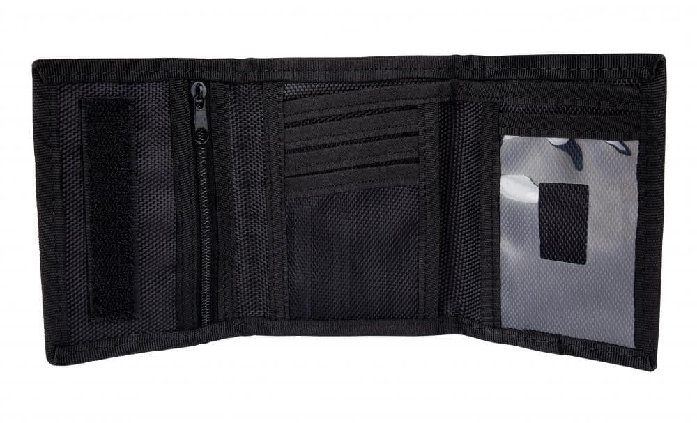 100% polyester, tri-fold wallet with printed logo, contrast bind, note and card slots, change pocket and ID window