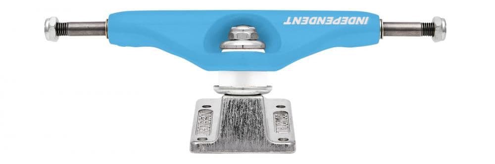 Independent BTG Speed trucks feature flat light blue hanger with Built to Grind laser etched logo and polished silver baseplate, silver hardware, and white cushions.